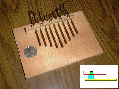 This extremely simple kalimba is a real instrument --- playability is great. Tone and volume is surprisingly good too. I made it to see just how simple a kalimba can be made. It's construction needs little or no description -- everything can be seen in the photo.