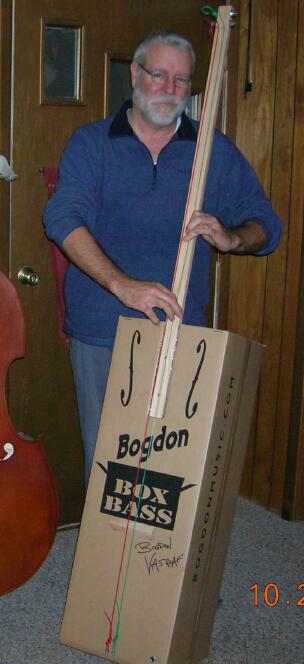 This is a picture of me with the cardboard bass. Chris sells these as a kit for only about $50 (postage paid)--- I just bought and assembled one and can tell you that the instrument is truly excellent, both without and with amplification (a complete piezo pickup setup is supplied with the kit). The thing uses .105" and .095" weed-whip line which impart a silky-smooth feel to playing. Despite having only two strings, the thing has clear access way up the neck and the lack of four strings isn't much of a concern after an hour or so of getting used to it. It compares very favorably with my commercially-made upright bass in both volume and tone. The piezo pickup to an amplifier sounds first-rate. I cannot remember when a fifty dollar expenditure has resulted in quite as much fun! You can learn more about this instrument by accessing www.bogdonmusic.com Dennis Havlena