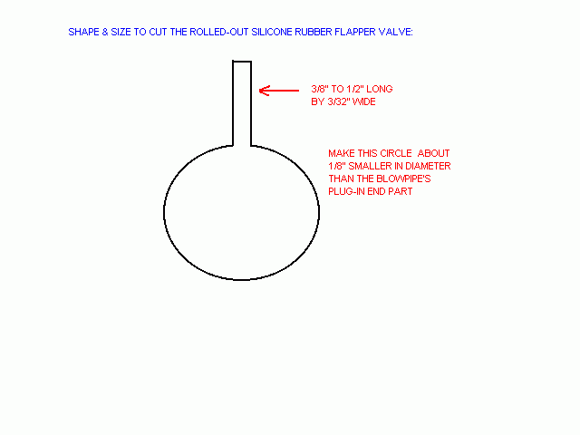 - Lay a foot square piece of waxed-paper out on a flat surface. - Cut two 8" long by 1/2" wide strips of cardboard. I find that the cardboard backing up a pad of legal paper is just the right thickness. Lay one strip vertically along on the left edge of the waxed-paper & then lay the other strip similarily along the right edge. These strips act as spacers to ensure that the finished silicone rubber valve is of the uniform and proper thickness. You may want to alter the thickness of these spacers if you like a thinner or thicker valve. - Deposit a 1" diameter (or so) glob of silicone rubber sealant (I prefer the clear variety) in the center of the waxed paper. The best type of sealer to use is the that which smells of vinegar. Make sure the brand you use has no fungicides or other such high poisons. - Apply a second foot square piece of waxed-paper on top of everything, then take a baking-type rolling-pin and slowly roll it along the two spacer strips to flatten out the glob of silicone rubber. Let cure at least 24 hours. This makes a uniformly thick sheet of "rubber" from which the flapper valve, described below, is cut. Incidentally, this method produces excellent gaskets for a variety of other purposes. MUCH enlarged view of silicone rubber flapper valve: --- / \ <- This is supposed to / \ be round & made about / \ 1/8' smaller in / diameter than that ,--------------' | of the blow-pipe's | tail | plug-in end part. '---------------, , \ / Make the tail about 3/32" \ / wide and 3/8 to 1/2" long. \ / This tail is used to mount the \ ___ / flapper to the blow-pipe.