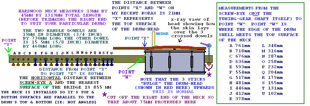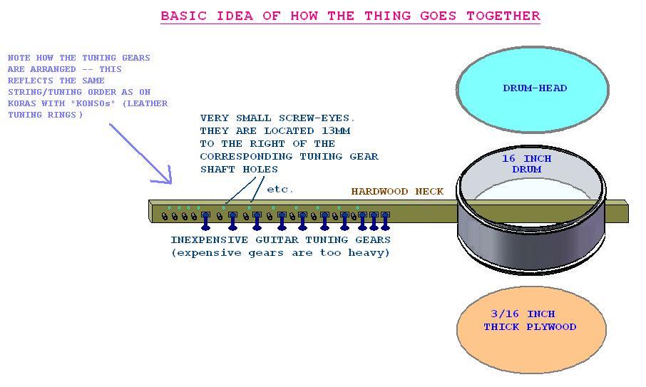 Recently returning from three weeks in Senegal, Africa (where I taught a workshop about building a variety of musical instruments using a lot of parts scrounged from discarded items) has greatly stimulated my latent high interest in the west African Kora. If I'd have only stuck with the Kora when I first became interested in it decades ago, perhaps I'd now be a good player instead of the beginner that I am! Moral: if you're interested in playing an instrument, JUST DO IT ! Life's only so long. In Dakar, I was given a beautiful traditional Kora, which survived the 4,500 mile jet flight back to northern Michigan perfectly. With this Gambian-built Kora in hand,I was able to determine exact dimensions and layouts that I previously had only guessed at or carefully interpolated from photos (lots of ratio & proportion) , so I proceeded to build another Kora (which will be detailed on my webpage - hopefully shortly*). Being on a roll, and armed with much new information (measurements etc), I also set about to build still another one Described here), this one using a snare-drum in place of a calabash (gourd) which works just fine. I have made a number of instruments based around snare-drums. Seems I can always find a "not expensive"such drum at Goodwill or Salvation Army. Or try shopgoodwill.com. My favorite clawhammer banjo I madefrom a cut-down 10 inch "First Act" (ie cheapie) Salvation Army snare drum. Wouldn't trade it for my most expensive banjo! A Kora may well look like a super-complicated collections of strings, tuning devices and what-not but because to make one, no frets, no curves or wood bending is involved and even the string length isn't very critical, building a nice, workable Kora is an easy, straightforward, few days of spare time type project. No fancy tools are needed. The illustrations in this article should cover most points & dimensions of building.