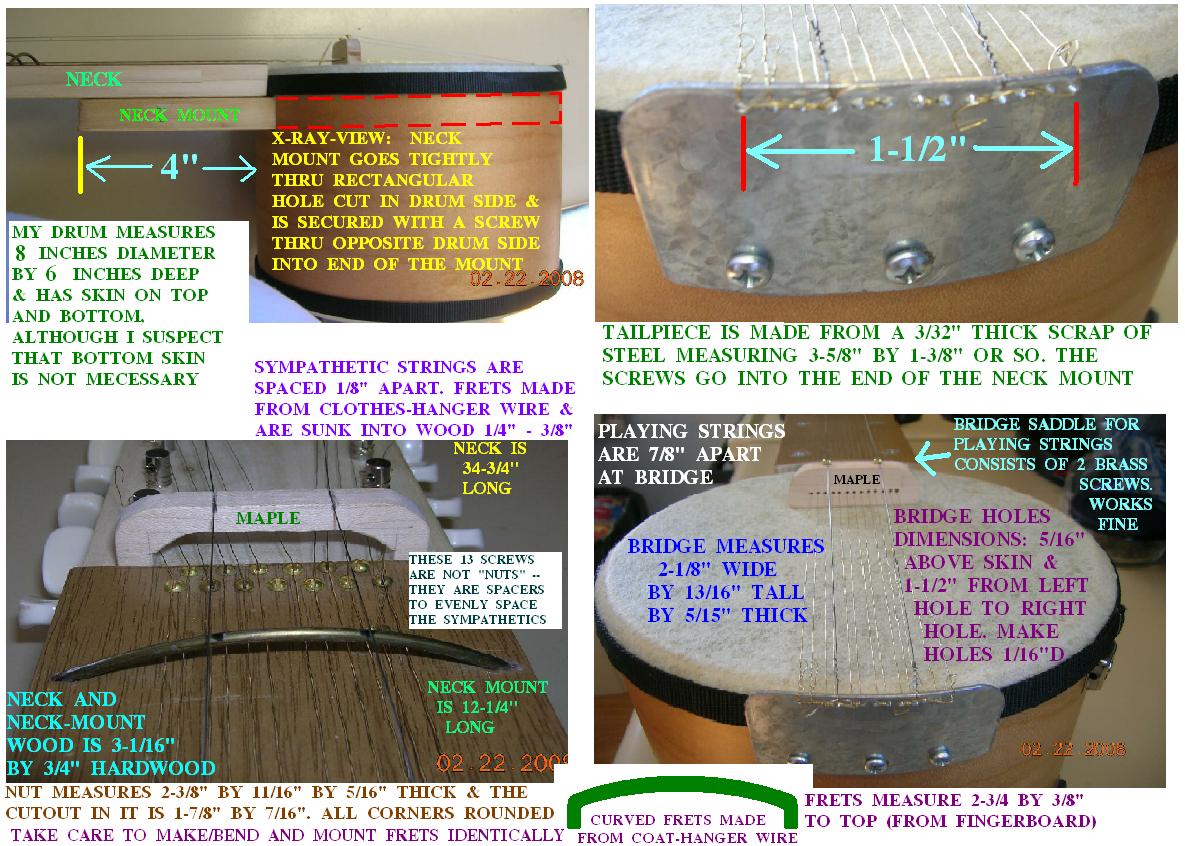 Components are few - the larger half of an inexpensive but sturdy bongo-drum; a plank of just about any type of hardwood; 15 guitar-type tuning machines; strings (mostly from a dismantled length of Wal-Mart vinyl-coated clothes-line); a few screws; a small square of scrap sheet metal and a few regular coat-hangers. I paid $19 for the bongo and less than $30 for the tuning machines. There's just about no other expense (but now my wife tells me that I have to replace the clothesline that I filched). CONSTRUCTION: In this, and many other cases, a picture (or a few) is worth a thousand words. Despite having 15 strings, this instrument is deceptively easy to build. There are only a few things to be careful of: - To avoid unwanted buzzes & even missed notes, the curved frets have to be made & mounted identical to each other in all aspects. They have to be mounted on the neck so that a straight-edge shows that no fret(s) are higher or lower than their neighbor along each playing string's length. This is not difficult. Slight differences can be lightly hammered into submission. - As far as string-length goes, you can avoid any trouble by simply making the string-length (nut-screws to bridge) the specified 27-9/16 inches, lest the pitch of the notes will be off. - Maintain the 1/8" spacing between adjacent sympathetic strings & center the 13 strings so that neither the highest-pitched nor the lowest-pitched threatens to vibrate against the underside of any fret. Remember that when strings vibrate, they "expand" outwards & can hit things. - Holes for mounting the frets must be drilled into the neck at the exact location specified. Making the neck: Again, I stress (throughout) look carefully at the photos. All necessary dimensions and construction details can easily be found there. I happened to have a plank of birch hardwood that I used for my neck. I sawed/sanded off the the last 9-1/2" of the neck's top surface so that the tuning machine posts would stick far enough through to wind the strings around. Another reason is to allow a better string angle as it approaches the nut. Neck thickness in this 9-1/2" neck-end area should be reduced to about 5/8". Modifying the bongo drum: The only modification needed is to cut a 3-1/16" by 3/4" rectangular hole in the side of the drum. It is important that the top edge of this hole be 13 millimeters (yeah I know) below the surface of the skin head. Make this hole slightly undersized initially, then slowly file it larger until the "neck mount" (see illustrations) just fits into the hole fairly tightly. The only other modification of the bongo drum is to drill clearance holes for the three tailpiece/neck-affixing screws. When positioning these screws, keep the top surface of the neck mount parallal with the skin head & be sure the center-line of the neck (& neck mount) will run right down the center-line of the drum. When the neck is inserted through the rectangular hole, it should be tight enough so that no glue is needed here. No glue is needed at the tailpiece end either. The diameter of the drum is not too important so long as you maintain the proper string-length. Making the frets: This is undoubtedly the most difficult part of making this instrument, but still, can be done in a couple of hours. The main concern here is that the frets be made/bent as identically as possible. The distance from the neck surface to the top of the mounted fret should be 3/8" in the middle. I bent short lengths of hanger wire around a glass bottle to achieve the curve. Very carefully, bend the mounting "plugs" on each end (I used two vise-grip pliers) - all the time comparing each fret with a "master fret" to ensure they are all the same. Clothes-hangers are made in a variety of wire thicknesses -- I tried to get the heavier gauge ones. File the ends of the mounting plugs so there are no snage which would interfere with plugging into the mounting holes drilled into the neck. Constantly referring to a good strait-edge, plug the frets into the neck making sure that everything is at the same lever etc. Do not use any glue -- yet. Once satisfied that the top of the frets is uniform as determined with the straight-edge (placed along each of the two playing string's route), then apply a small drop of super-glue to the place where the metal meets the wood. This works nicely to keep frets in place. If, after the glue sets, your straight-edge shows you that one fret is high, carefully tap with a light hammer til fixed --taking into account that if you tap a high spot on a fret, a low-spot can develop elsewhere on the fret. Come to a happy-medium. Low spots can be raised by careful prying from beneath. If all else fails, simple pull the offending fret and make another one. I was able to make every offending fret work fine and did not have to do this. Strings: Main playing string is .013" music wire (aka #4 music wire) 2nd playing string is .015" Sympathetic strings are all .009" music wire (aka #1-0 music wire) Tuning: - Main playing string is G# (in the octave just below piano's middle C) - 2nd playing string is D# (In the octave just below piano's middle C) The 13 Sympathetic strings are tuned like this (low-to-high pitch): - G# - A# - C (this note matches middle C on a piano) - D# - F - G# - A# - C - D# - F - G# - A# - C (one octave above middle C on a piano) - D# Let me know if you have any questions. PLEASE let me know if you build one of these. There are some very beautiful videos of the Esraj on YouTube ---- just input the search-word esraj. Dennis Havlena - W8MI dhavlena@gmail.com Mackinac Straits, northern Michigan 10/15/2008