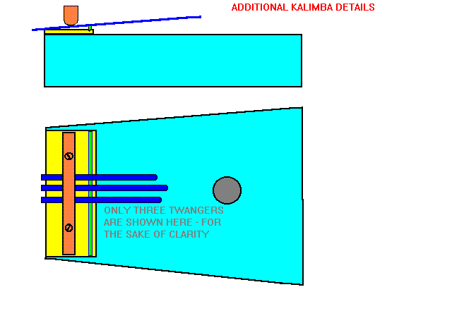 _______||_______ / || \ /________||________\ DEPRESSOR BAR- /| o o |\ "o" = woodscrews / ~~~~~~~~||~~~~~~~~ \ hanger-wire "nut"- /nnnnnnnnnnn||nnnnnnnnnnn\ /------------||------------\ / || \ / || \ Only one twanger / || twanger \ is shown here / || \ for the sake / \ of clarity / \ / \ / \ ~~~~~~~~~~~~~~~~~~~~~~~~~~~~~~~~~~~~~~~~~~ Now the depressor bar is added. It tensions the twangers and keeps them in place. This depressor bar is simply a 1/2" by 1/2" by 5-1/4" long piece of hardwood with the bottom rounded off (actually made "U" shaped). Countersunk holes are drilled 1-1/2" from each end. Two large wood-screws go through these holes, through the "bridge" & sound-board and into the hardwood framing member. These holes should be 1/2" from the rear edge of the "bridge". The twangers are routed under the depressor bar. Put 5 twangers to the left of the left screw, 4 to the right of the right screw & 7 in the area between the screws. "Fan" them out symmetrically. Only one of the 16 twangers is shown in the above illustration. "Exploded" side-view showing how twangers are mounted: ~~~~~~~~~~~~~~~~~~~~~~~~~~~~~~~~~~~~~~~~~~~~~~~~~~~~~~ (much enlarged) * * * * * * * * Two hefty woodscrews * end-view of * that go through the * "depressor bar" * depressor, through the * * bridge and into the * * frame of the kalimba * * serve to push down on * * & thus tension the * * 16 twangers. * * * * ___________________________________________________T_W_A_N_G_E_R__ () |~~~~~~~~~~~~~~~~~~~~~~~~~~~~~~~~~~~~~~\/~~~~| The () represents | | an end view of | | the "nut" which -------------------------------------------- is a length of END view of "bridge" (twanger "base") coat-hanger wire that is glued to the rear edge of the instrument's top/soundboard. The ~~\/~~ represents the shallow notch or groove along the entire length of the "bridge" into which a 5-1/8" length of coat-hanger wire lays. This wire acts as a "nut" over which the 16 twangers ride. ******************************************************************* STEP #7 Making the twangers: The instruments I have made all are in the basic key of G. There's no reason you can't cut the twangers for any key you desire. g e f# c d a b f# g d e b c g a f# OVERALL length of twangers I used for the key of G: First octave: f# - 4" g - 3-7/8" a - 3-3/4" b - 3-1/2" c - 3-3/8" d - 3-1/4" e - 3-1/8" Second octave: f# - 3-1/16" g - 3" a - 2-7/8" b - 2-13/16" c - 2-3/4" d - 2-5/8" e - 2-9/16" Third octave: f# - 2-1/2" g - 2-3/8" - The rake-tines are easiest "cut" by breaking them with two pair of pliers, or by bending & hammering them over with one end in a vise. - I use a hand grinder to grind the finger-ends of each twanger to a "U" shape. Dull anything sharp on the other ends. - The existing paint on the tines does not seem to hurt the tone or volume, but I have scraped it off too. - When it's time to mount the twangers, slightly tension the depressor bar then insert the twangers under the bar in their proper order. Turn the wood-screws a bit & "fan-out" (properly space etc) all the twangers. Then crank down on the two wood-screws not too far past the point where the twangers are held securely & not too easily moved. - Tune each twanger to it's proper pitch by forcefully wiggling and pushing/pulling it. I find that even with considerable downward pressure from the depressor bar, the individual twangers can still be budged around enough. You DON'T want to have to loosen the two woodscrews to facilitate tuning. Use either a chromatic electronic tuner or simply compare the twanger pitches to the notes on a pitch-pipe, or properly tuned guitar etc. PS: Different width rake-tines should work nicely as well -- you'd just have to experiment some. ******************************************************************* Dennis Havlena - W8MI Mackinac Straits, northern Michigan