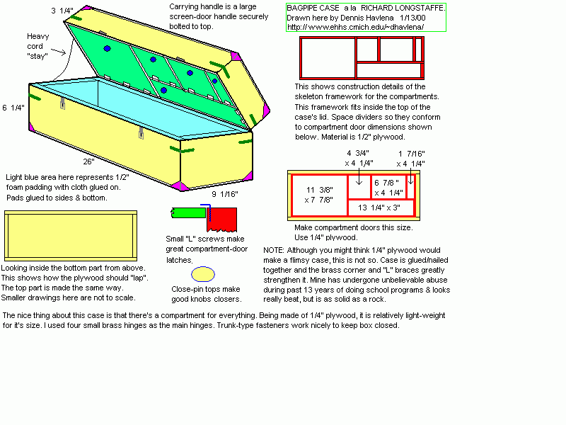I learned piping from Richard Longstaffe in Florida. His dad had made him a big, light-weight and very roomy pipe case out of braced 1/4" plywood. I was so taken with the functionality of this case that I built a carbon copy of it which has been in nonstop, hard use for many years. Although beat up on the outside, it has never failed me & provides lots of room for piping accessories not found in more conventional cases.